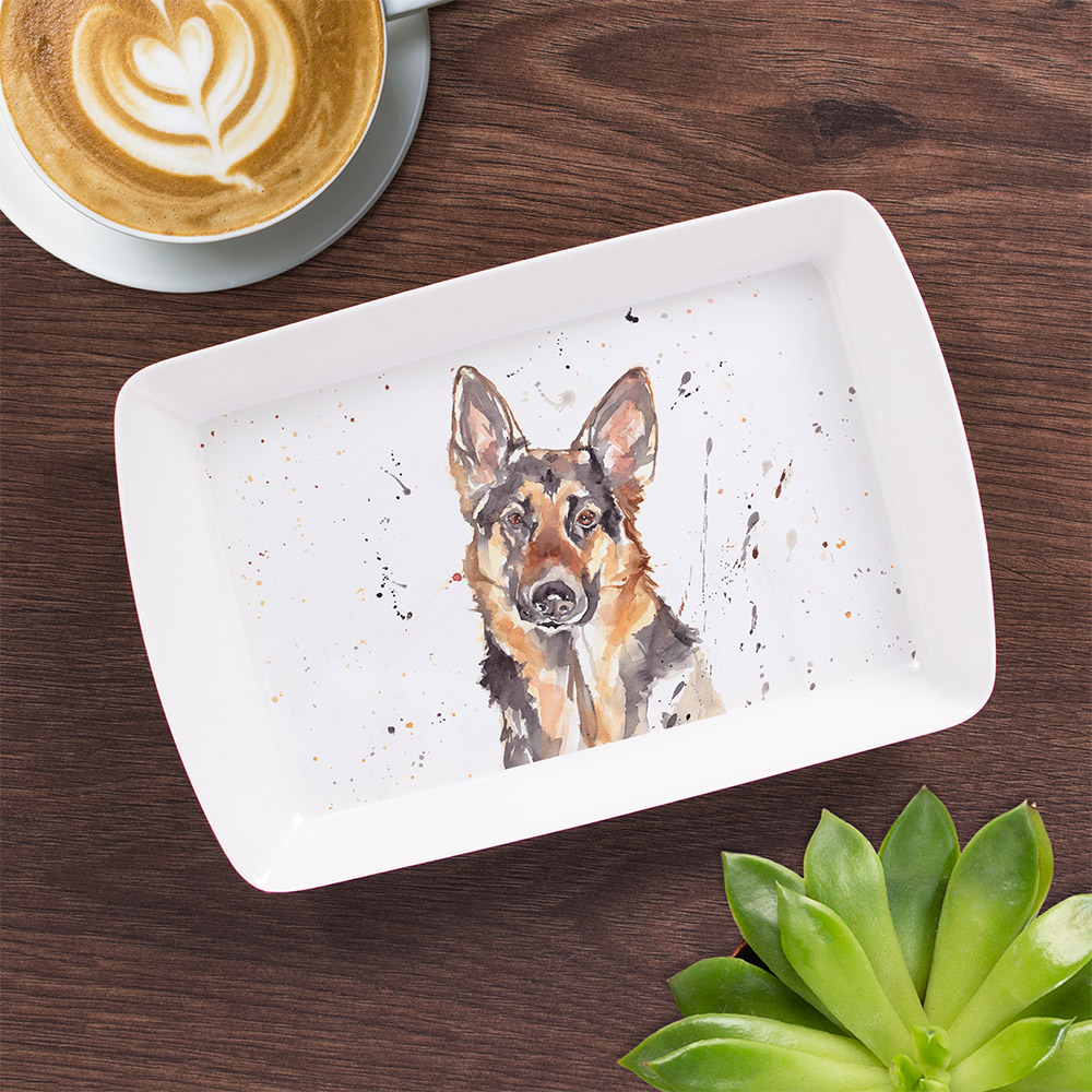 Liten bricka ur Man’s Best Friend-serien, dekorerad med en schäfer. Tillverkad i melamin.