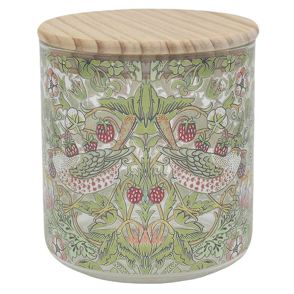 Tillverkad i glas med trälock och dekorerad med William Morris populära mönster Strawberry Thief.